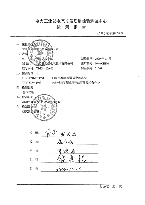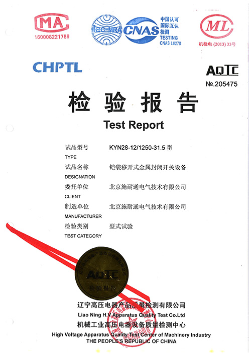 KYN28-12/1250-31.5 型铠装移开式金属封闭开关设备检验报告